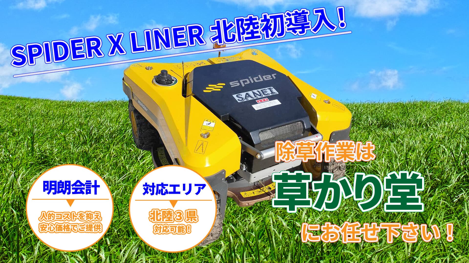 草かり堂は「SPIDER X LINER(スパイダークロスライナー)」を北陸初導入!360°回転の細かい運動性能と斜度 45°可能となる作業性、軽量小型ボディは太陽光パネル下の作業も含めあらゆる場所の草刈り作業が可能です。もちろん作業には熟練の操縦者が担当して行いますのでご安心ください。